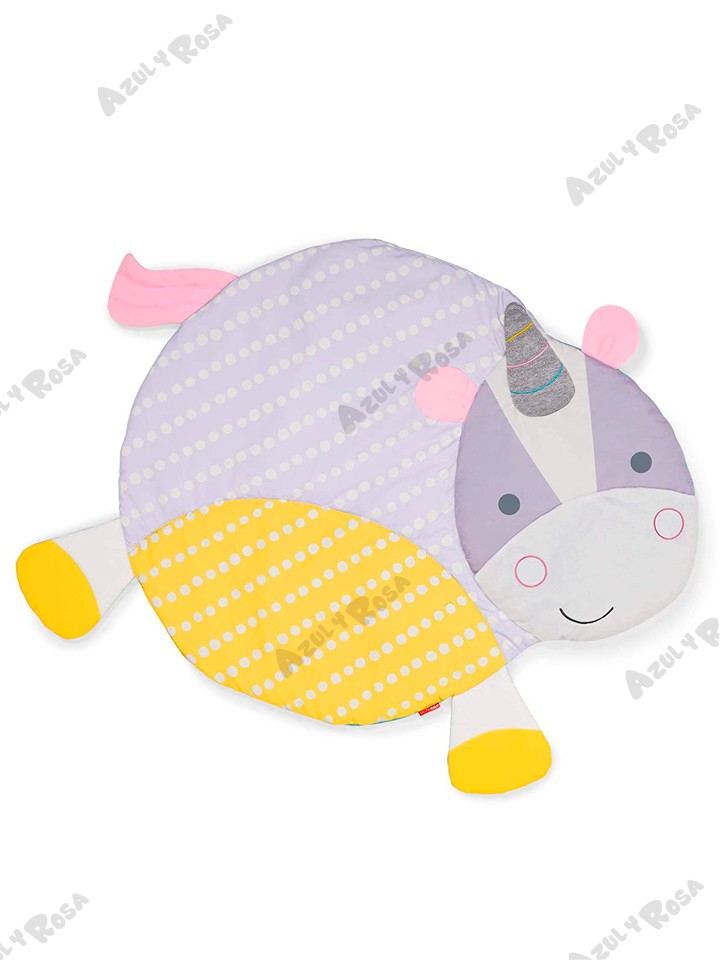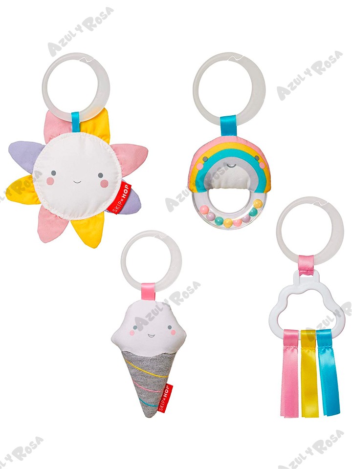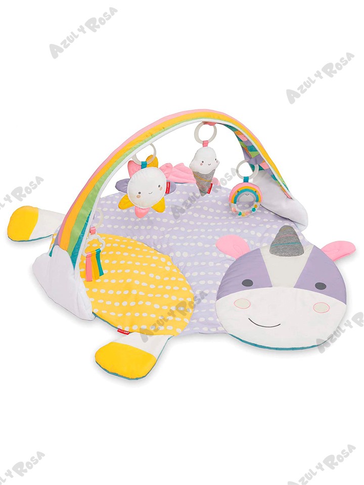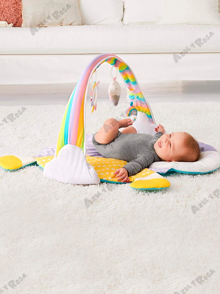 Tres formas de jugar: juego de cabeza, tiempo de barriga y juego sentado. Incluye múltiples texturas para la exploración táctil y cuatro juguetes para colgar: espejo de sol seguro para bebés, cono de helado musical que reproduce canciones alegres, sonajero arcoíris, nubes con cintas de satén de colores.