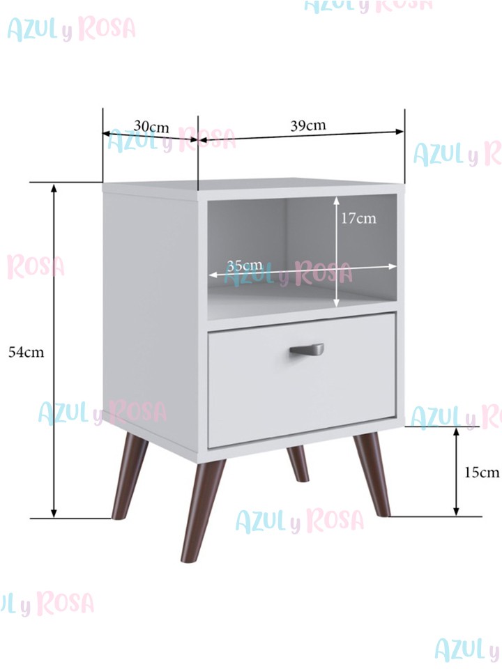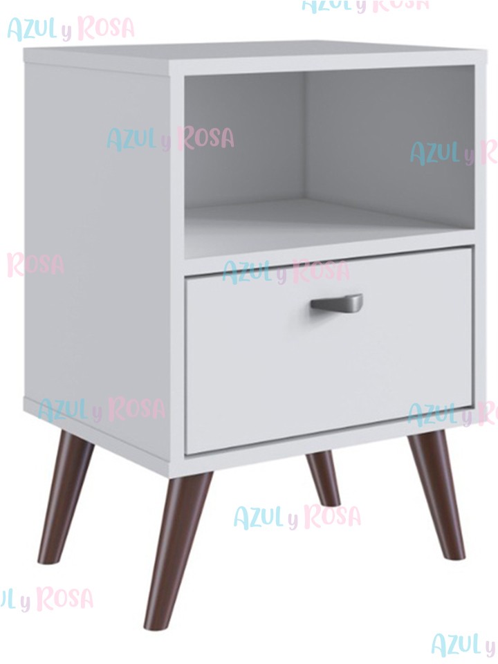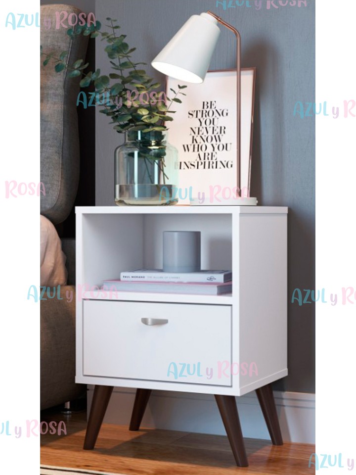 Cuenta con un cajón y una división para almacenamiento y terminada con una parte superior ancha a la altura justa para sostener una lámpara o elementos de decoración. Está hecha de MDF fuerte y resistente y está pintada con un acabado duradero de color blanco brillante.