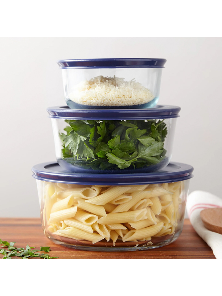 Ideal para el refrigerador, el congelador o la despensa, este set de 3 recipientes de vidrio y 3 tapas azul segura mantiene los bocadillos y las sobras frescas. Con tres tamaños redondos versátiles, estos recipientes facilitan el almacenamiento de alimentos o el embalaje de comidas para llevar.